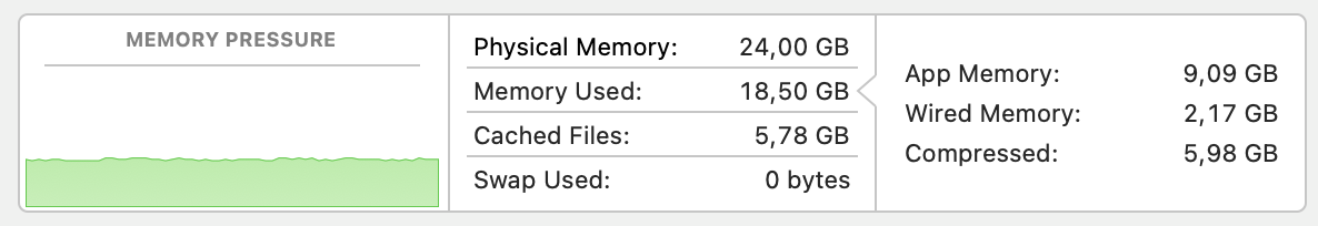 For completeness, here is a screen dump of the macOS activity monitor, right after a CMS process has stared outputting these messages – no visible effect on the overall memory pressure chart.