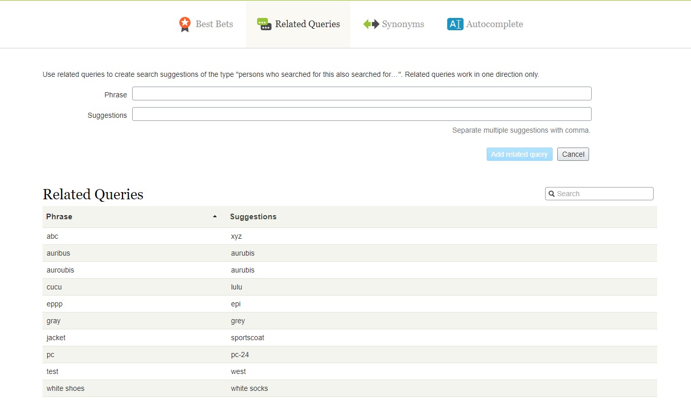 Thanks for the info, after we set few Related Queries it appeared to work. In addition, this article https://world.episerver.com/documentation/developer-guides/search-navigation/NET-Client-API/searching/Related-Queries/ gave some more inputs.